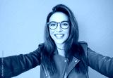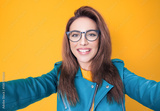 Close-up smile woman takes photo of himself with her mobile phone. Selfie, wearing blue leather jacket, isolated on yellow background. Focus on face