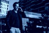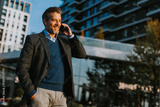Businessman in smart attire walking while talking on phone in modern urban setting during sunny afternoon