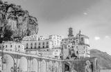 Atrani famous coastline in southern Italy, vertiginous cliffs adorned with colorful villages, turquoise waters. Small town Atrani on Amalfi Coast in province of Salerno, Campania region, Italy