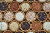 Topview various rice in wicker for background