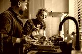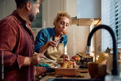 Mid adult couple preparing lunch together in kitchen.