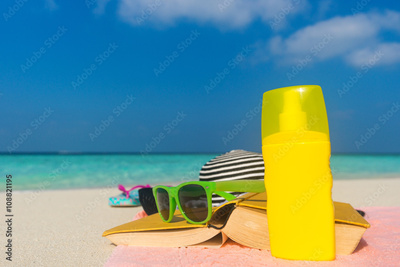 Sunscreen, hat and sunglasses on tropical beach