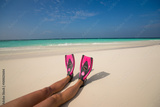 Woman relaxing on summer beach vacation holidays lying in sand.