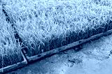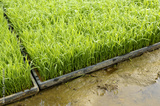 Rice paddy field young rice seedling plants growing in wooden trays prior to planting south korea photo