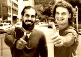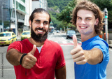 Zwei Freunde in der Stadt zeigen Daumen hoch