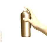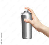 A hand holding a silver metallic spray can, isolated on a clean white background. Ideal for a product mockup or packaging design template