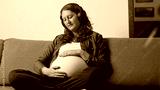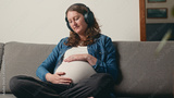Pregnant Woman Relaxing on Couch with Headphones Enjoying Music in a Peaceful Home Environment