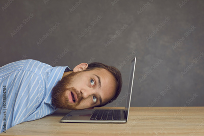 View from the side of a focused man who puts his ear to the laptop listening intently to its sounds. Bearded man in a shirt sits at a table and puts his head to the computer and looks up thoughtfully.