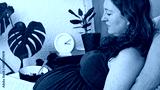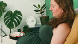 Pregnant Woman Relaxing at Home While Reading and Enjoying a Healthy Snack
