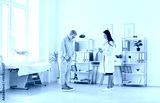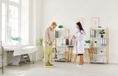 A doctor, nutritionist, or nurse weighs an elderly patient on a scale during a clinic examination. Health assessment, ensuring the patient well-being through regular monitoring and care.
