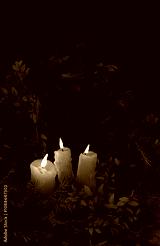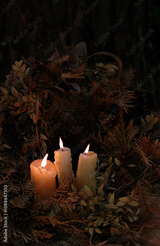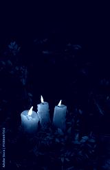 burning candles in dry autumn leaves, abstract dark nature background. mysterious fairy scene. Samhain, Halloween holidays. Witchcraft, esoteric spiritual ceremony, magic ritual with wax candles