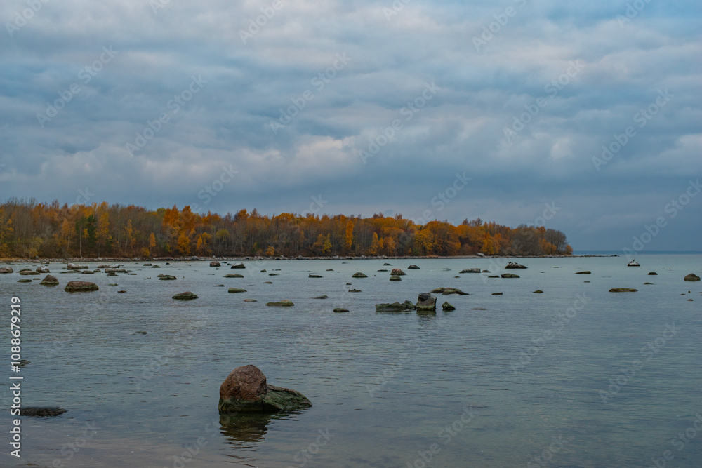 Peaceful autumn landscape at Paljassaare Peninsula in Tallinn, Estonia. The shoreline features a calm, shallow Baltic sea with scattered rocks emerging from the water. In the background autumn forest.