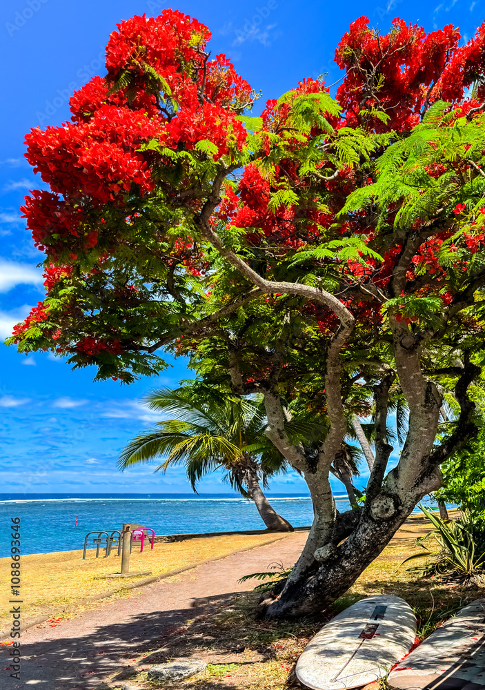 Flamboyant fleuri sur plage du Bassin Pirogue, île de la Réunion