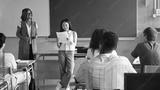 Asian girl college student reading project presentation to classmates and teacher at High School