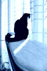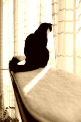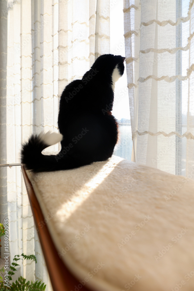 A black and white cat sits on cat furniture and looks out the window
