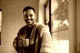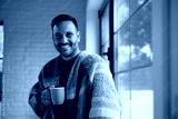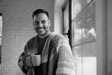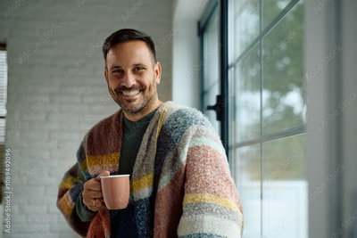 Happy man with cup of tea standing by window and looking at camera.
