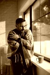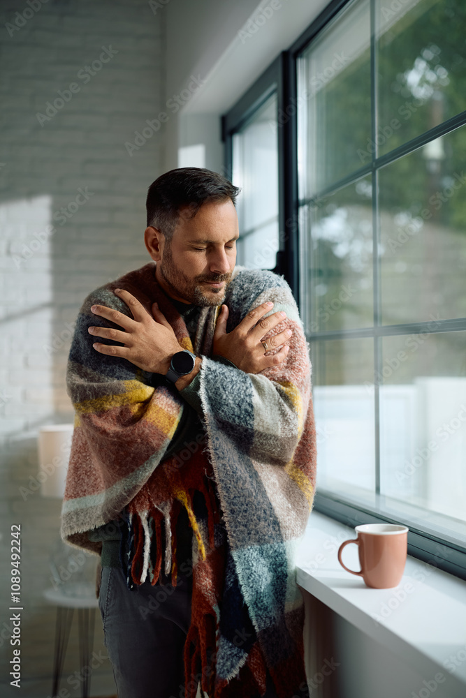 Man wrapped in blanket trying to warm up while standing by window at home.