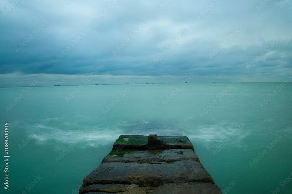 A calm seascape in long exposure with blurred water and a stone pier.