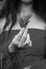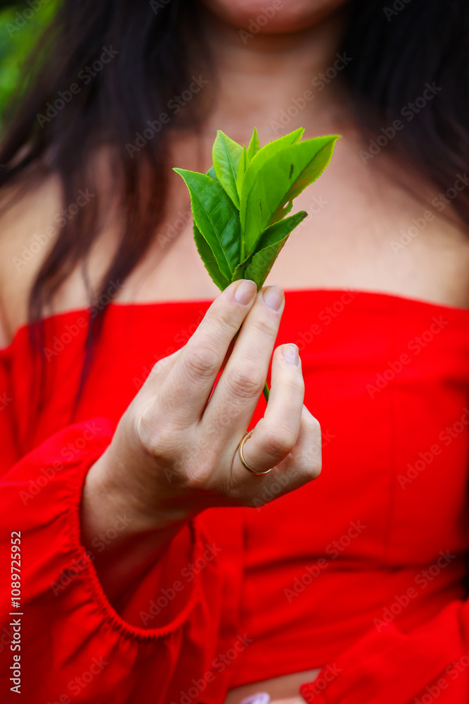 A woman's hand holds tea leaves. Advertising of Ceylon tea.