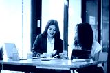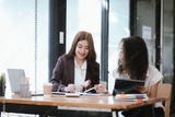 A confident Asian businesswoman and her colleague are having a joyful conversation at a desk in an office. Both are smiling and working professionally.