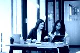 A confident Asian businesswoman and her colleague are having a joyful conversation at a desk in an office. Both are smiling and working professionally.