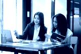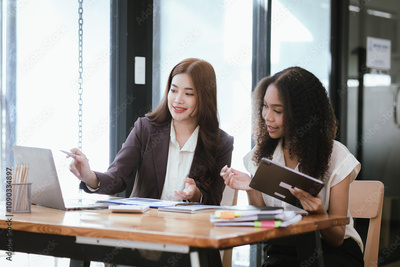 Two businesswomen in an office, business colleagues are having a conversation.