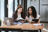 Two businesswomen in an office, business colleagues are having a conversation.