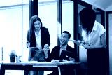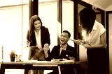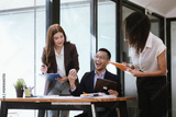 Group of young Asian business people gather at desks in office to discuss and analyze financial data in chart format during team meeting.