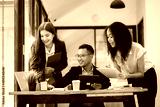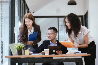 Group of young Asian business people gather at desks in office to discuss and analyze financial data in chart format during team meeting.