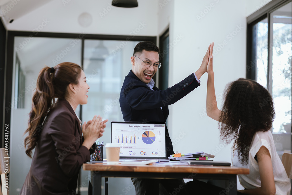 Group of young Asian business people gather at desks in office to discuss and analyze financial data in chart format during team meeting.
