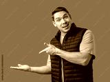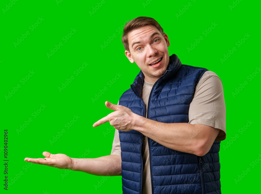 Man in a navy vest gestures while standing against a bright green background