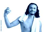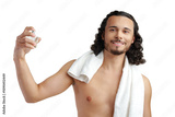 A young man with curly hair applying fragrance after a shower while smiling at the camera