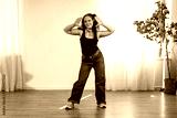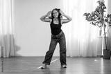 A young woman with curly hair poses for a photo in a studio