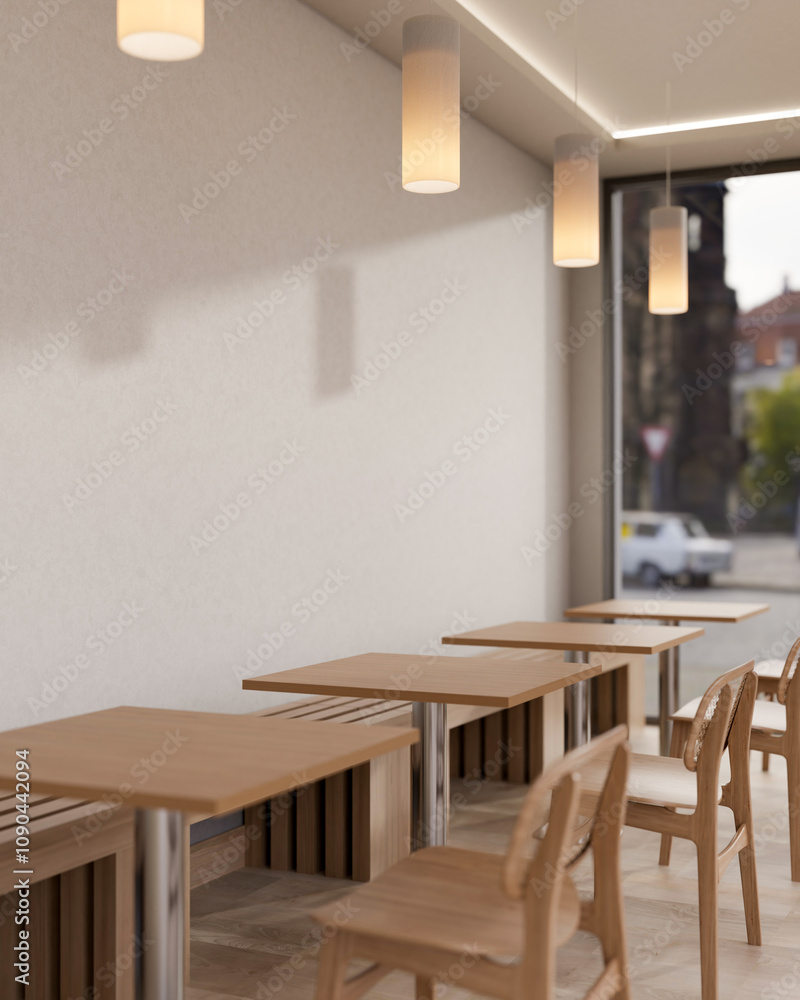 A minimalist and comfortable coffee shop features a row of minimalist wooden table and chair.