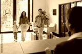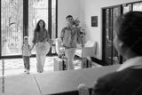 Young family entering hotel lobby carrying luggage, being greeted by receptionist at front desk. Smiling parents accompanied by small child holding hands