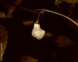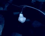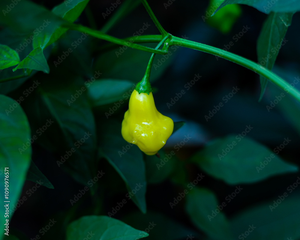 Ripe yellow Aji Fantasy pepper on plant branch green foliage at backyard garden in Dallas, TX, translucent bonnet-shaped chili Capsicum baccatum developed in Finland, rounded top pinched middle