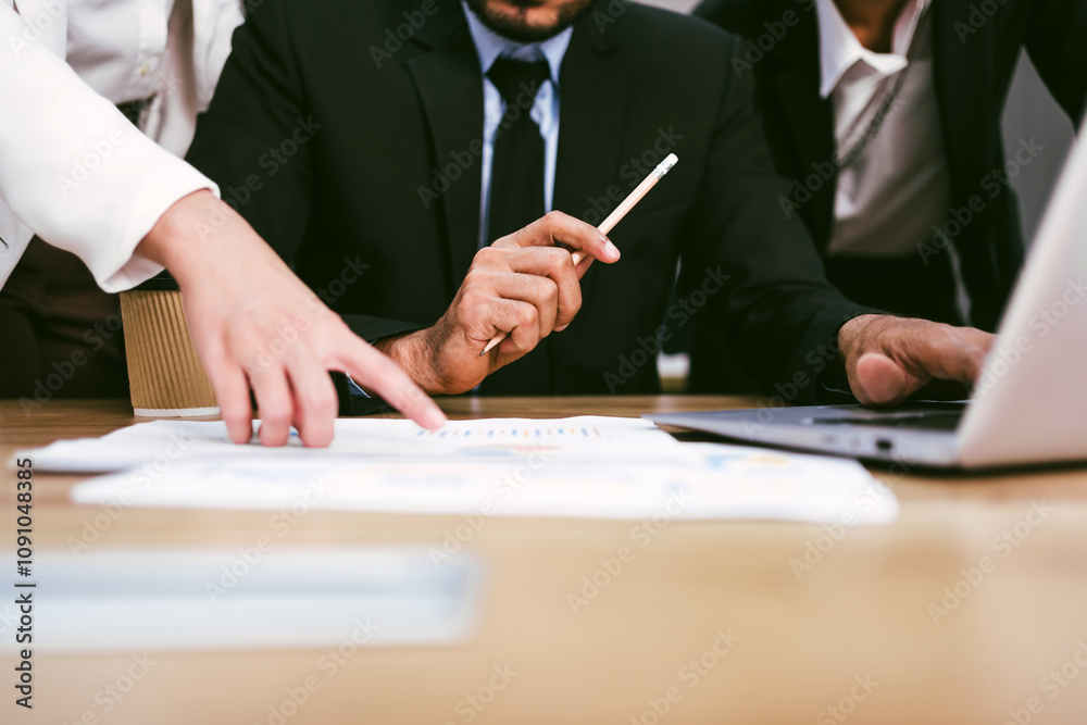 Business team collaborates over documents and a laptop, discussing strategies and ideas in a professional setting. discussing strategy and brainstorming. Multiracial business people in meeting concept