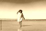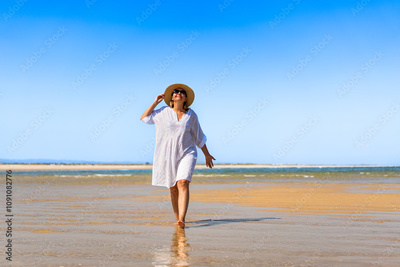 Beautiful middle aged woman in white summer dress, beige sun hat and sunglasses walking on sandy beach in summertime. Front view. Armona Island, Portugal. Most beautiful beaches in world