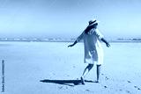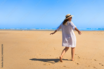 Beautiful middle aged woman in white summer dress, beige sun hat and sunglasses spinning around on sandy beach in summer. Back view. Outflow on Armona Island Portugal. Travel destination. Happiness.