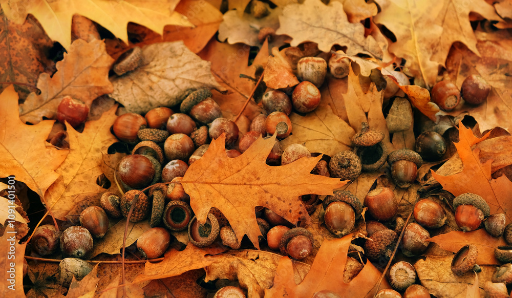 autumn background. dry fallen oak leaves and acorns of northern red oak (Quercus rubra) close up, natural forest backdrop. symbol of autumn harvest season. fall time. flat lay