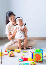 asian parent seated on the floor at home is clapping hands happily after letting go of her kid to stand by leaning on a chair with a toy.,The mother is happily playing with toys with her daughter.,
