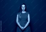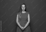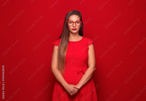Serious young woman standing with neutral face expression, isolated on red background. Pretty girl.