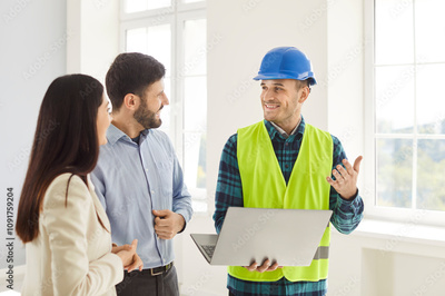 Foreman collaborates with a husband and wife, reviewing construction blueprints for a home renovation project on a laptop. Discussion highlights teamwork and detailed planning of future living space.
