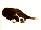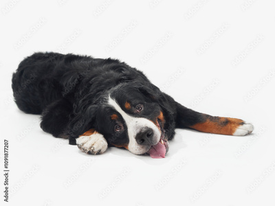 A Bernese Mountain Dog lying on a white background with its tongue out, showing its relaxed demeanor. The dog appears content and calm.