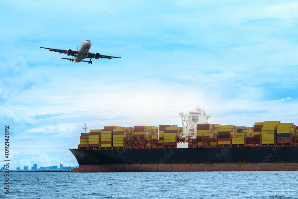 Aerial view of the freight shipping transport system cargo ship container. international transportation Export-import business, logistics, transportation industry concepts
