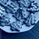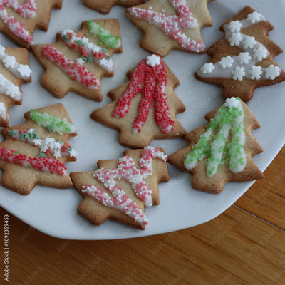 Christmas tree shaped gingerbread cookies on a white plate on wooden table