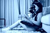 A side view of a happy woman enjoys reading a book in the living room during the Christmas night.