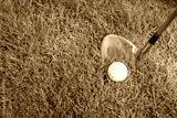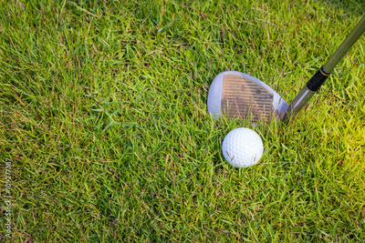 Golf club and ball in grass