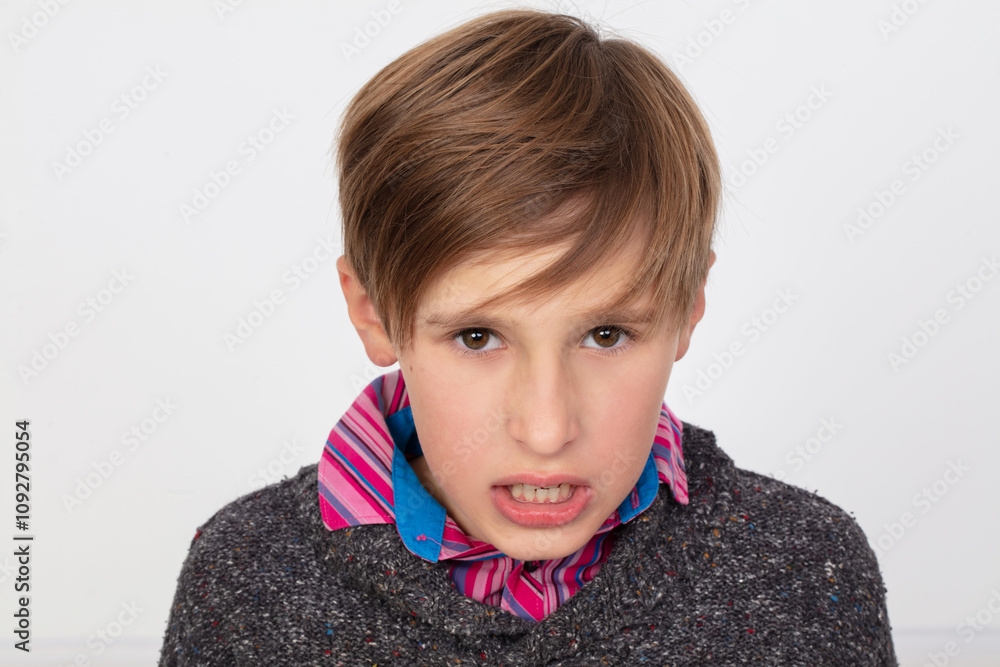 A boy in a striped shirt and a blue scarf looks at the camera with a frowning expression on his face.