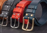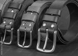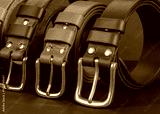 Leather belts with metal buckles on a gray background.